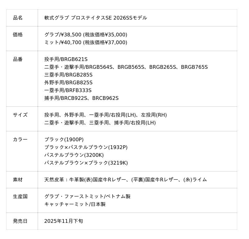 【プロステイタスSE】は、グラブに対して強いこだわりを持つ「本格派軟式プレーヤー」に向けた高い操作性と耐久力を併せ持つ特別仕様バージョンです。2026SSモデルは、NEWウェッブ/フラットアウルを搭載した投手用、中村奨吾タイプのダブルクロスウェッブの三塁手用、やや小ぶりで操作性の高いTベルトMGウェッブの外野手用、小林誠司タイプのコンパクト捕手用ミットの4モデルを新たにラインナップに加えました。