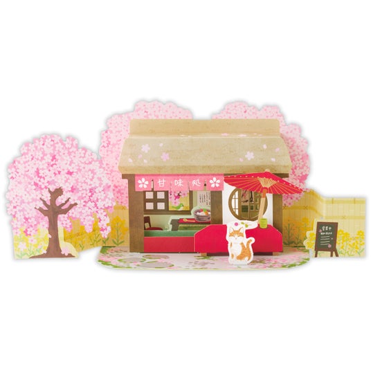 サマーカードで長年人気の機構・お店型立体が春柄カードに! 可愛らしい看板猫がいるお茶屋さんをイメージ。大きな桜や野点傘、テーブルの上の白玉あんみつなど細かいモチーフまでこだわって描きました。