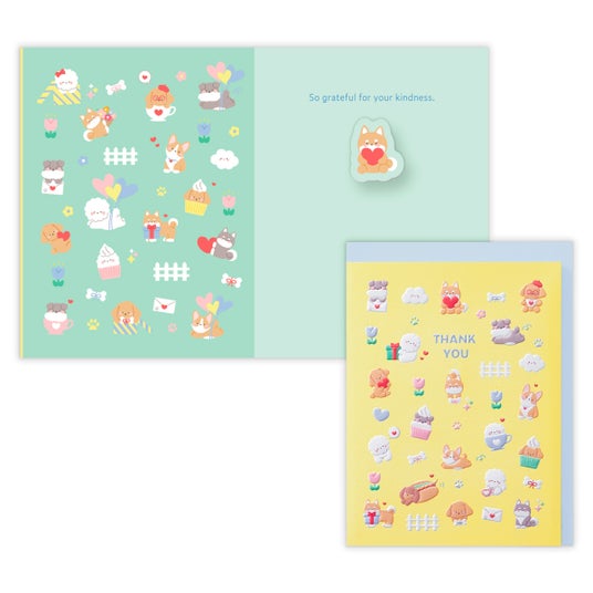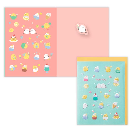 近年シールなどで人気のぷくっとした凹凸や、ツヤのある質感をカードに取り入れました。エンボス加工とUV加工を組み合わせて、モチーフをぷっくり感ある仕上がりに。カードを開くとバネ付きの動物がゆらゆら揺れます。表紙には小さなモチーフがぎゅっと集まり、見た目の楽しさと手に取ったときの質感が魅力です。