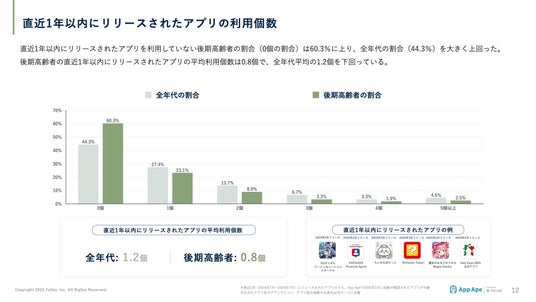 後期高齢者の直近1年以内にリリースされたアプリの平均利用個数は0.8個で、全年代平均の1.2個を下回っている。新規アプリへの接触は限定的であることが示されています。