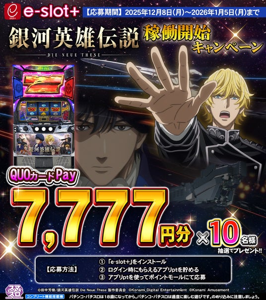 また、「e-slot+」アプリで体験版をプレイし、アプリptで応募頂いた方の中から抽選で、「QUOカードPay」7,777円分を10名様にプレゼントする『e-slot+体験版「銀河英雄伝説 Die Neue These」キャンペーン』、さらに、公式Xにおいてフォロー&リポストいただいた方の中から抽選で1名様に77,777円分の「QUOカードPay」が当たる「スマスロ『銀河英雄伝説 Die Neue These』稼働開始記念フォロー&リポストキャンペーン」を開催します。