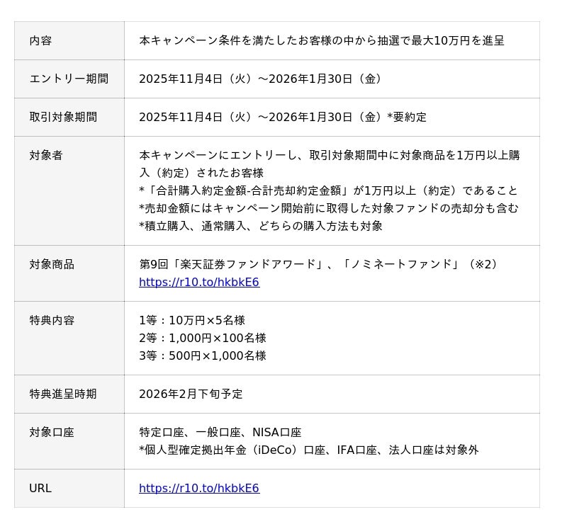 なお、「楽天証券ファンドアワード」を資産づくりにお役立ていただくべく、楽天証券が選出した「ノミネートファンド」を対象に、2025年11月4日(火)から2026年1月30日(金)までの期間中に合計1万円以上購入(約定)したお客様の中から抽選で、最大10万円が当たる「第9回 楽天証券ファンドアワード開催記念キャンペーン」を実施中です。