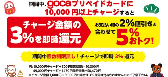 期間中、gocaプリペイドカードに10,000円以上をチャージしていただくと、チャージ金額の3%を即時還元(プリペイド残高に反映)します。通常サービスの「お支払い時2%値引き」と合わせると、実質5%分が還元される大変お得なキャンペーンです。