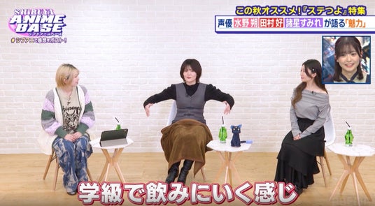 そんな息ぴったりな3人にアフレコの裏話を聞いてみると、水野より「アフレコ終わりに飲み会がすごいあって…」というと、田村も「学級で飲みに行く感じ。楽しく飲み会をしていた記憶がある」といいます。諸星も「アフレコ途中参加でドキドキしてたけど、飲み会で一気に距離が縮まって、その後の収録がすごく楽しかった。作品はシリアスな部分も多いけど、和やかな雰囲気の現場で楽しかった」と振り返ります。