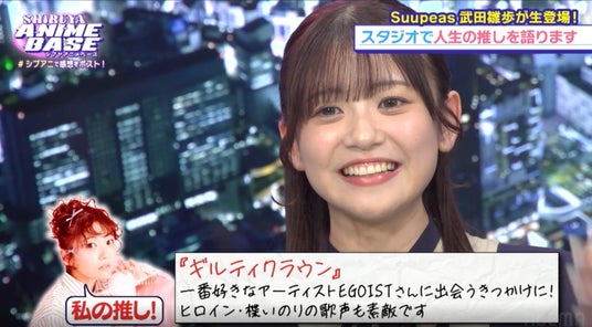 またゲストがアニメにまつわる人生の“推し”を語るコーナー「私の推しな書き」では、今回のゲスト・Suupeas・武田雛歩のアニメ遍歴を紹介。人生が変わった作品として『ギルティクラウン』を挙げます。「アニメをレンタルビデオショップで借りたり、叔父がくれたパソコンで夜通し見たりしていたらこの作品に出逢いまして、一番好きなアーティスト・EGOISTさんに出会うきっかけとなった」「EGOISTさんが人生でした、ずっと好きだって言ってたらEGOISTさんのTシャツの着用モデルもさせていただいた」とTシャツを紹介し、スタジオを驚かせました。