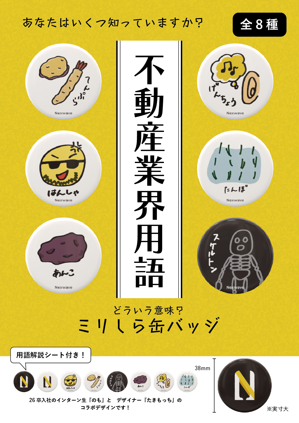 不動産にまつわる様々な業界用語を、ゆるいイラストで表現した缶バッジとなっております。弊社のデザイナーとインターン生が共同で制作した、オリジナルのデザインです。