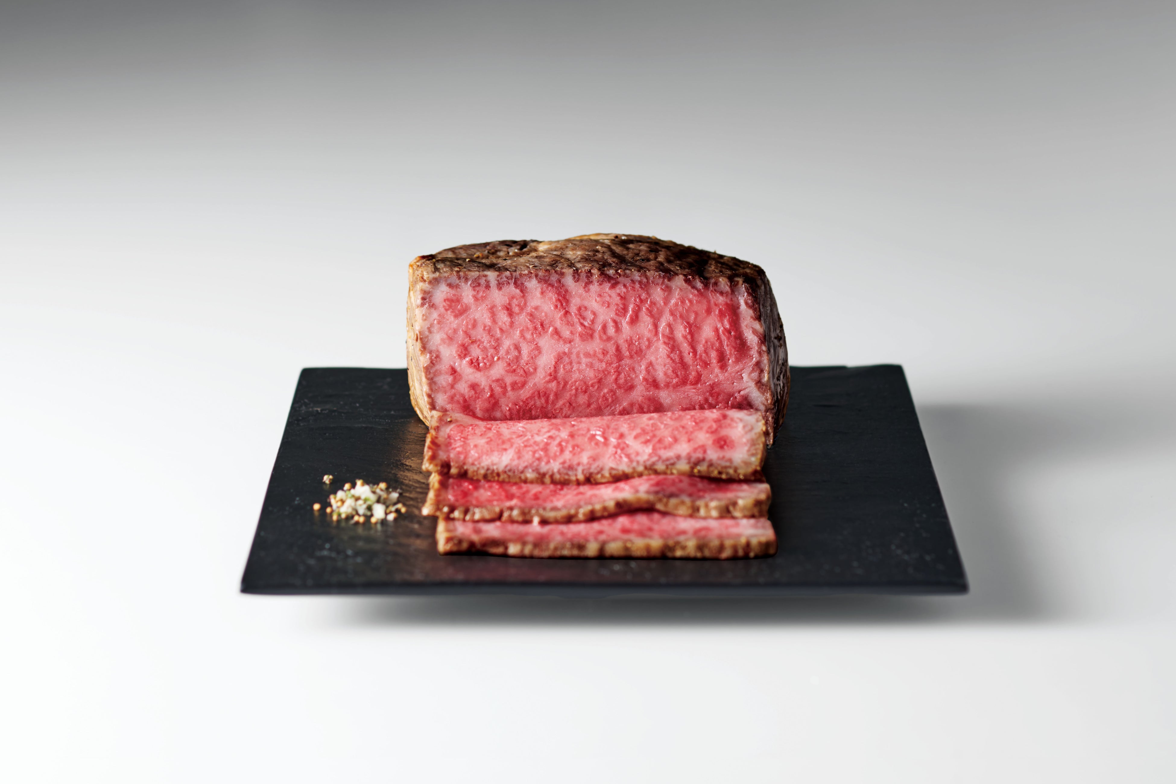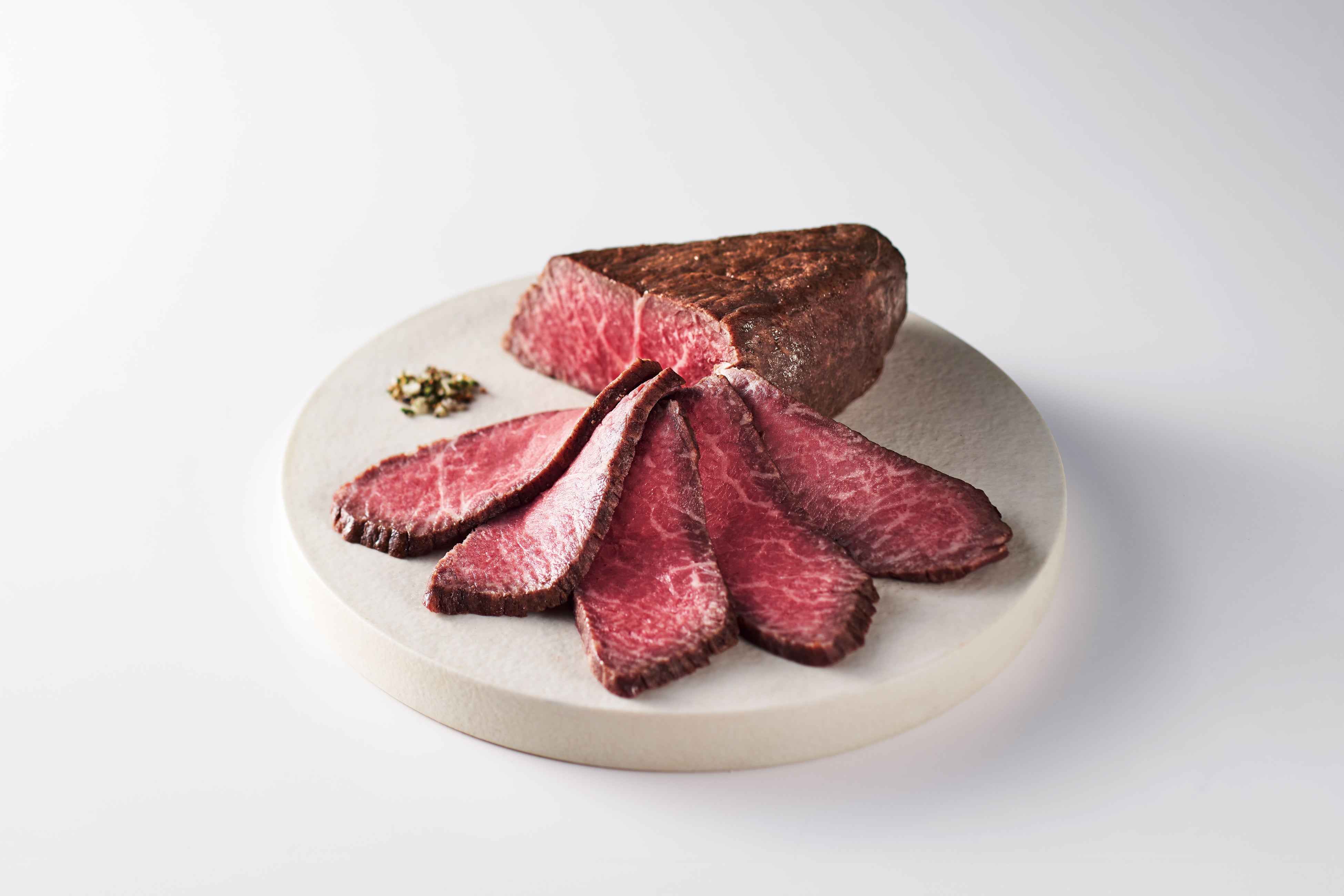 奥出雲和牛A4~A5等級を使用したローストビーフ(内モモ)。しっとりとした赤身の旨みと、上質なサシのとろける口どけが特長。仕上げに〈八雲塩〉を添えて。