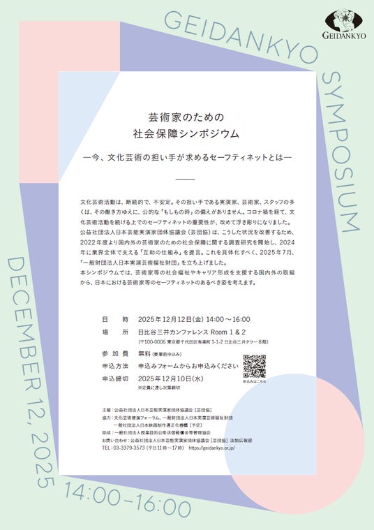 また、芸団協として、2025年12月12日(金)に公開シンポジウム「芸術家のための社会保障シンポジウム―今、文化芸術の担い手が求めるセーフティネットとは」を日比谷三井カンファレンスで開催。芸術家等の社会福祉やキャリア形成を支援する国内外の取組から、日本における芸術家等のセーフティネットのあるべき姿を考える。