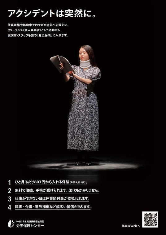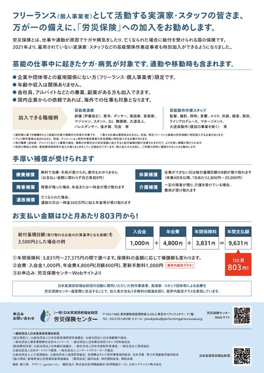 この画期的な仕組みによって、これまで金銭的な理由で保険加入を踏みとどまっていた実演家・スタッフ等の担い手たちの労災保険特別加入を促進し、万が一に備えながら、安心して仕事を続けていくことを実現していく。