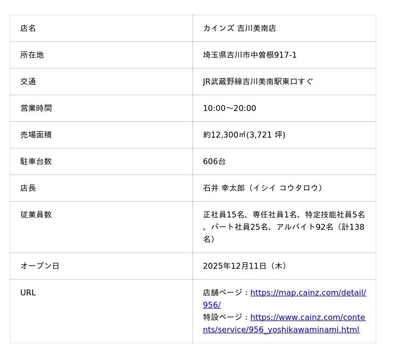 株式会社カインズ(本部:埼玉県本庄市、代表取締役社長 CEO:高家 正行、以下「カインズ」)は、次世代型店舗の初号店となる「カインズ 吉川美南店」が2025年12月11日(木)に、グランドオープンすることをお知らせします。