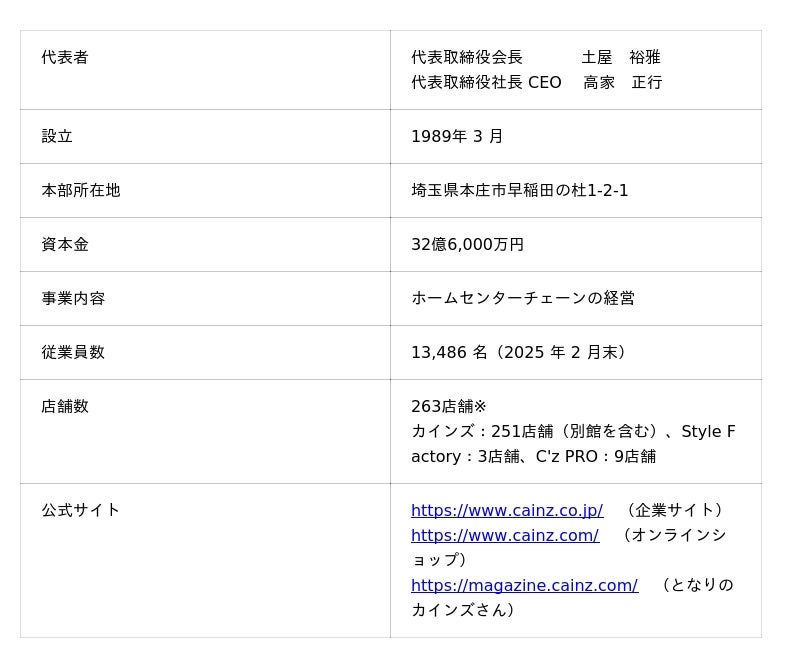 株式会社カインズは、29 都道府県下に263店舗※を展開するホームセンターチェーンで、「くらし DIY」をブランドコンセプトに、くらしを豊かにする価値ある商品・サービスを開発し、お値打ち価格で毎日提供します。また、買い物がなくてもつい立ち寄ってしまいたくなる、居心地の良いワクワクする店舗空間で、メンバーのKindness(親切心)と最新のテクノロジーを通じて買い物がしやすく、楽しくなるサービスを提供します。そして、お客様一人ひとりの、ご家族の、そして地域の日常を楽しく豊かなものとし、お客様とのプロミスである「くらしに、ららら。」をお届けします。