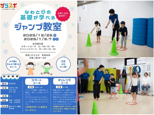 なわとびが苦手・跳べない子向けの冬休み限定「ジャンプ教室」。専門教室からスポが短縄を使わず“跳ぶ感覚”から丁寧にサポートし、少人数制で「できた!」を育みます。