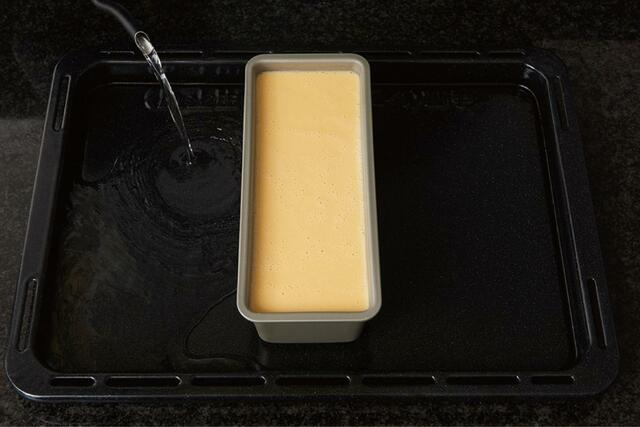7. 6を天板に置き、、天板の1/2の高さまでお湯を張って、140℃のオーブンで50分~1時間湯煎焼きをする。焼き色がついてしまうようであれば、表面にアルミホイルを被せる。