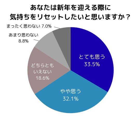 1.新年に「気持ちをリセットしたい」と感じる人は65.6%新年を迎えるにあたって気持ちをリセットしたいと思うかを尋ねたところ、「とても思う」「やや思う」を合わせて65.6%の人が「リセットしたい」と回答しました。現代社会において、新年を心の切り替えの重要な機会と捉えている人が多数を占めることが明らかになりました。