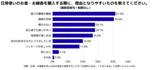 日常生活でお香・お線香を日常使いしている人に対して、その使用時間について尋ねたところ、「5-10分未満」が50.0%で最も多く、次いで「10-30分未満」(27.5%)、「5分未満」(14.4%)という結果になりました。購入時に重視する点については、「香りの種類が豊富」(41.6%)と「価格が手頃」(40.6%)が上位となり、次いで「煙が少ない」(28.1%)、「初心者でも使いやすい」(28.1%)、「短時間で楽しめる」(26.6%)が続きました。