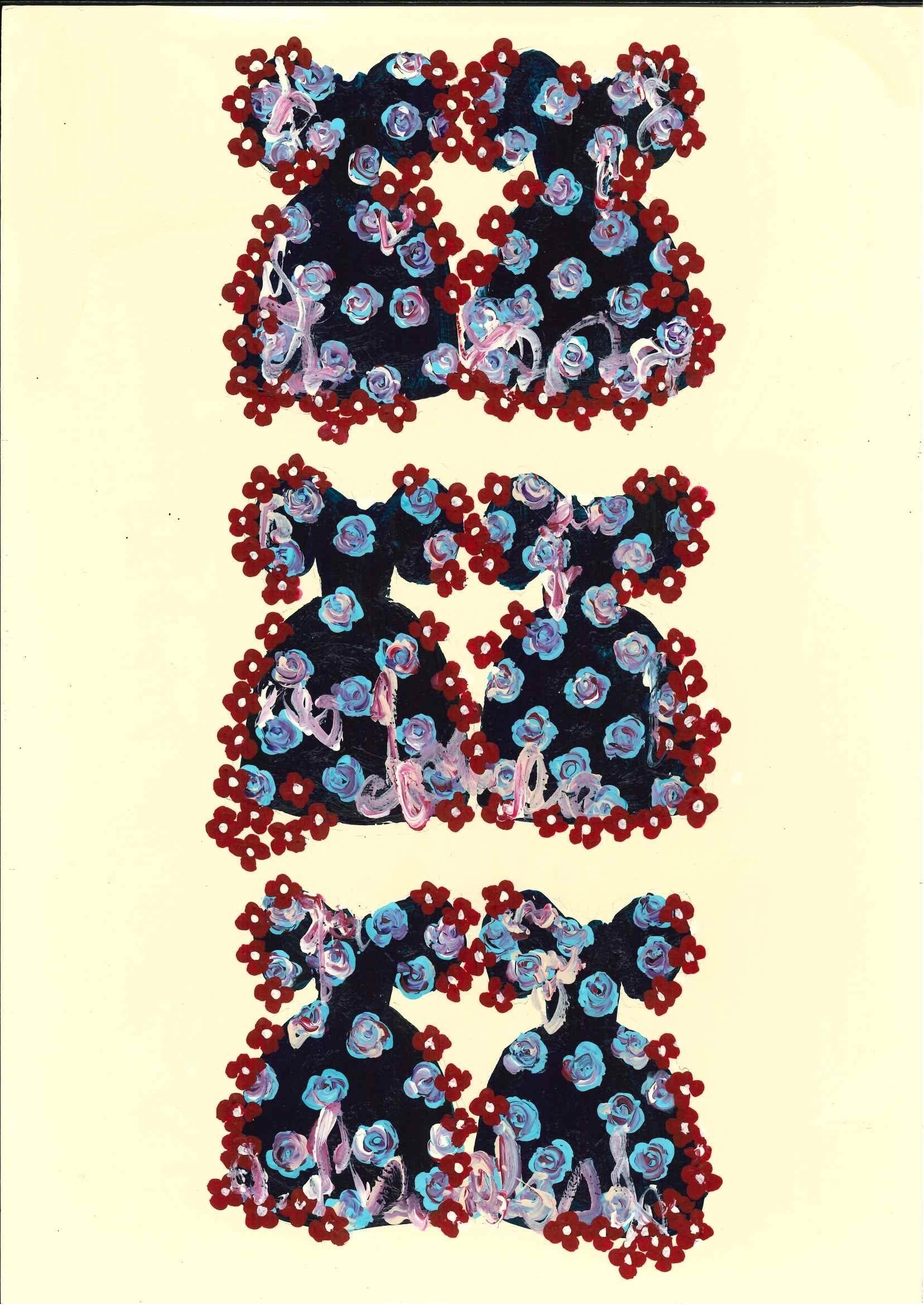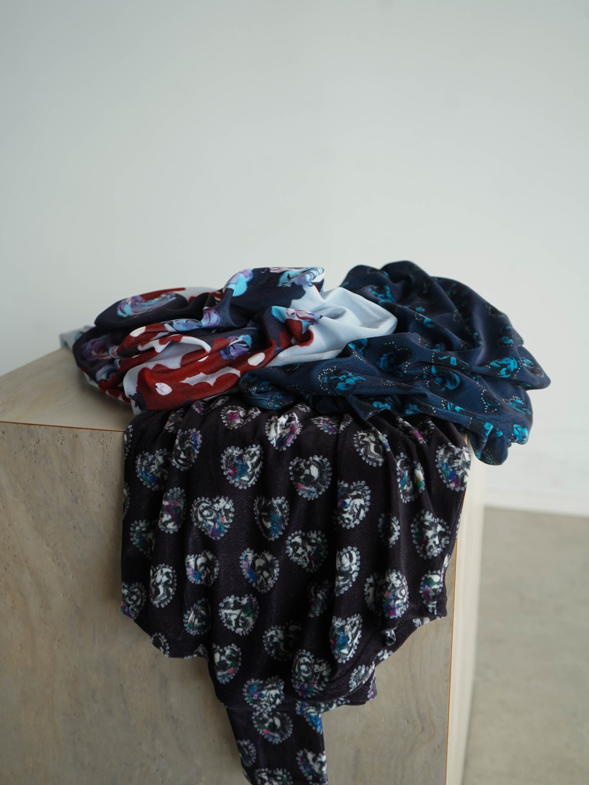今回のコレクションでは、アーティスト maya 氏のアーカイブからフラワー、ハート、ドレスの3モチーフをピックアップし、そこからイメージを共有しながら打ち合わせを重ね、RADIATEのために3柄を書き下ろしていただきました。