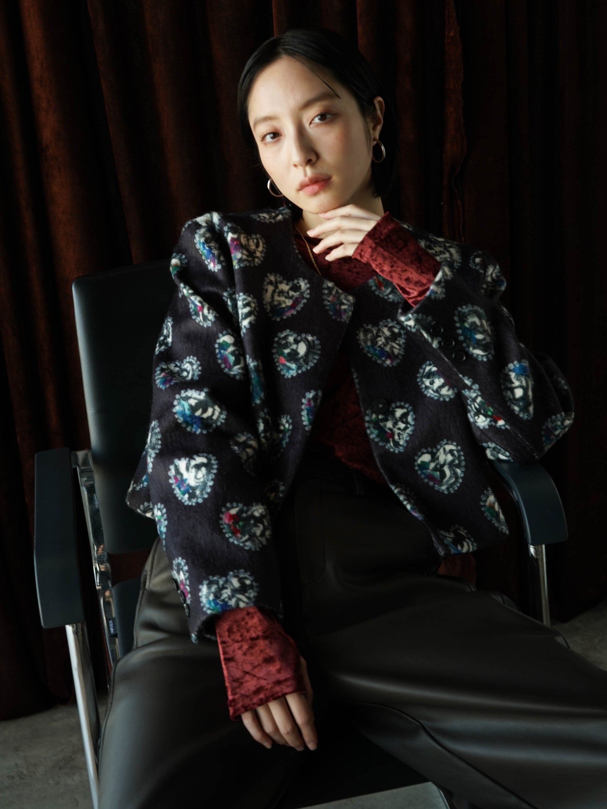 ショートジャケットには、毛足のあるシャギー素材の上からプリント加工を施した生地を使用し、2柄で展開しています。寒い時期に取り入れやすいよう、ほどよい凹凸感のある素材をセレクトしました。