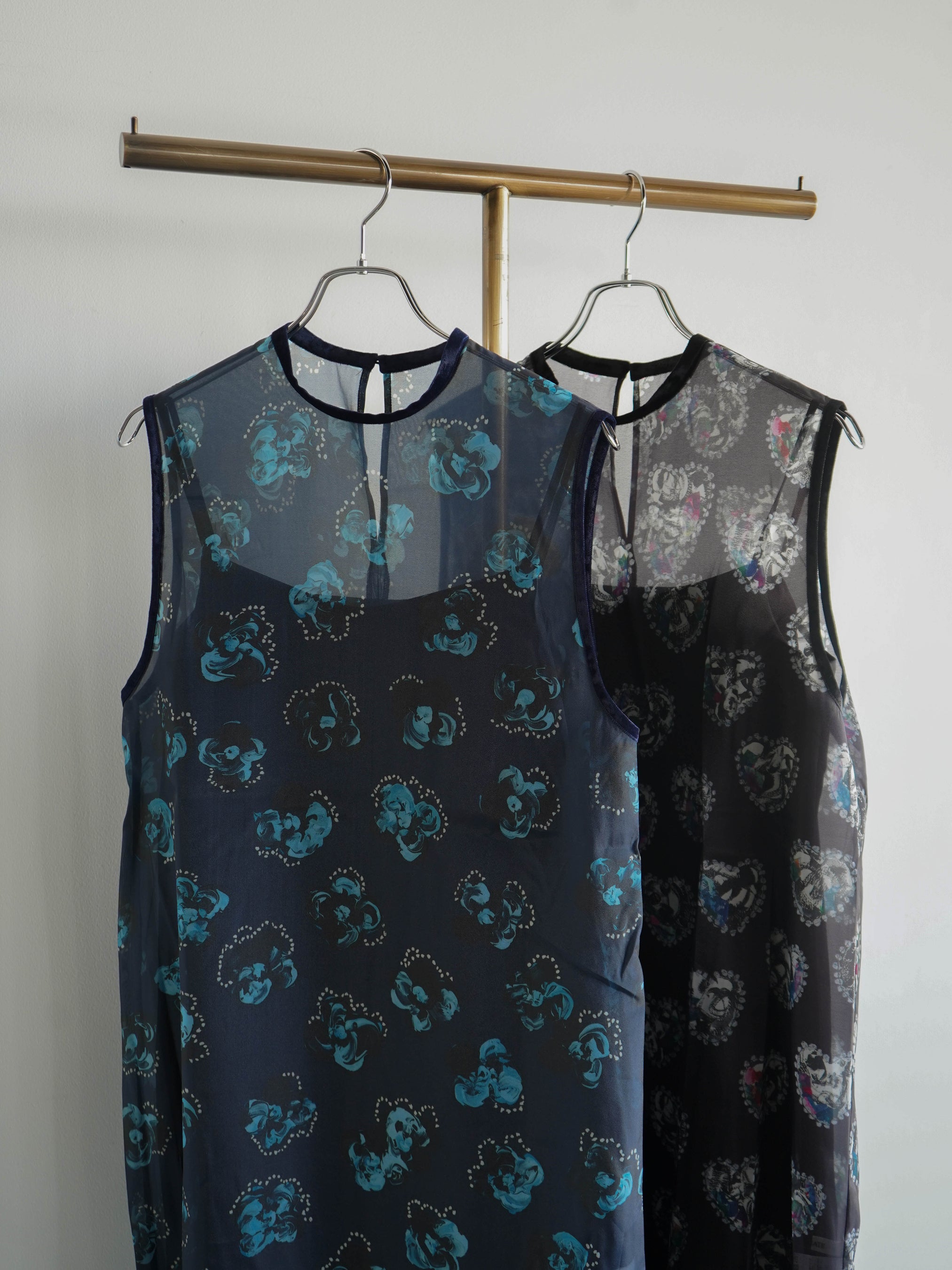シアーワンピースは2柄で展開。透け感を活かした素材にプリントを施しており、存在感のある大柄ながらも、着用すると自然に馴染む軽やかな仕上がりです。