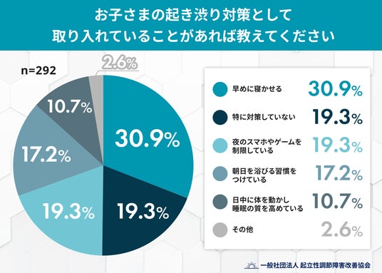 - 起き渋り対策では「早めに寝かせる」が多く、「対策していない」家庭が続く