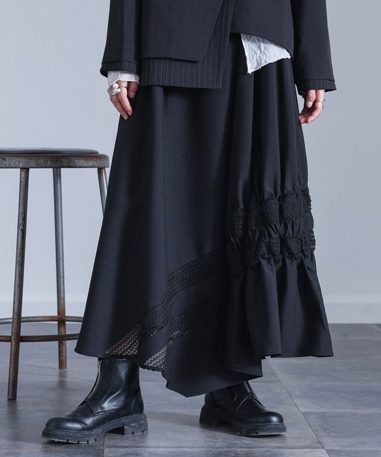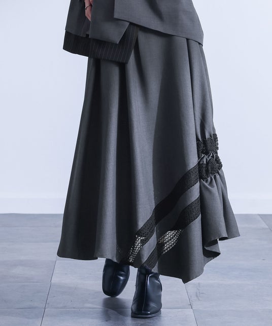 イレギュラーヘムデザインに斜めに切替レースとギャザーが入ったスカート。程よいフレアシルエットでさりげなく体型カバーも叶います。後ろはベルト中心にゴムを入れ、ラクな穿き心地を叶えます。