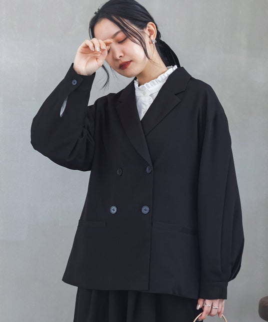 立体的なボリューム袖で存在感を引き出す、主役級ジャケット。パターンにこだわった美しいダブルテーラードラインと、シャープなカフスデザインでモードな印象に。あえて短めに仕上げた丈感が抜け感とスタイルアップを同時に叶えてくれます◎
