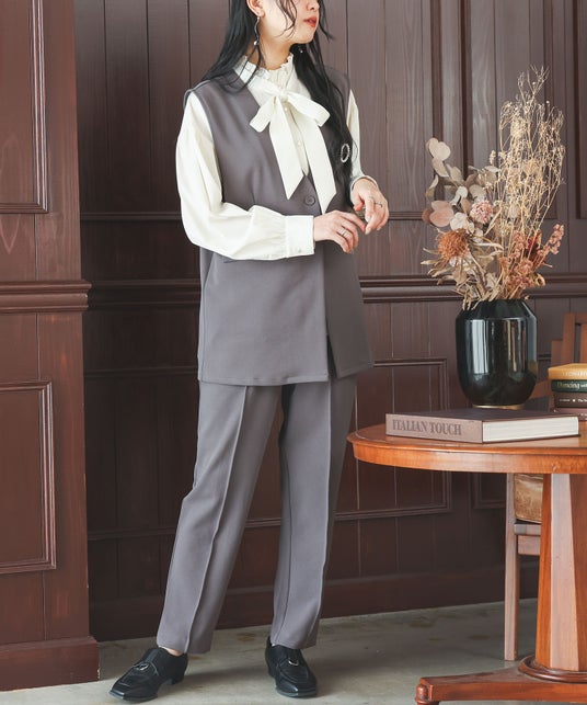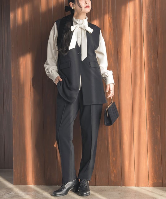 ボウタイ・ブラウス・ジレ・パンツの4点セット。オケージョンはもちろん、単体使いでデイリーにも着回しやすい優秀アイテムです。ジレとパンツは洗濯機で洗えてシワになりにくいイージーケアが特徴。伸縮性のある梨地ジョーゼット素材を使用しているため、一枚でも透けにくい生地感です。