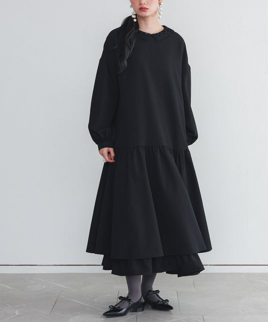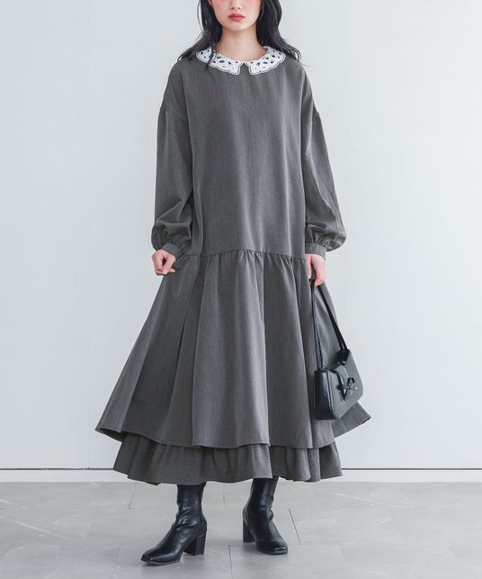 白いレース襟が装いのアクセントになる、上品なデザインワンピース。ティアード切り替えの裾が生み出すふんわりとしたボリューム感と、ドロップショルダーによるゆったりとしたシルエットが、抜け感のある女性らしさを引き立てます。ぽわんとした袖の形も、さりげない可愛らしさのポイントです。