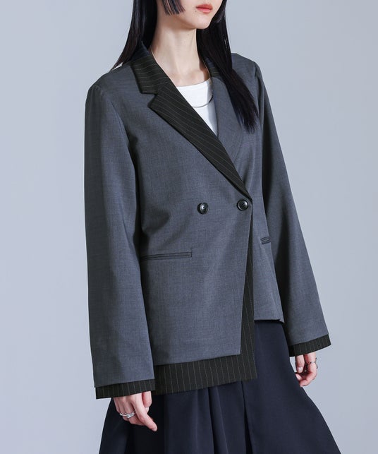 半身頃がストライプ柄生地と無地の生地が重なったデザインのジャケット。左右アシンメトリーのデザインで、袖口にもストライプ柄生地を重ねて細部までこだわった一着です。