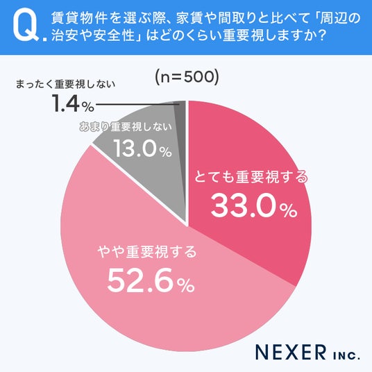 質問1:賃貸物件を選ぶ際、家賃や間取りと比べて「周辺の治安や安全性」はどのくらい重要視しますか?