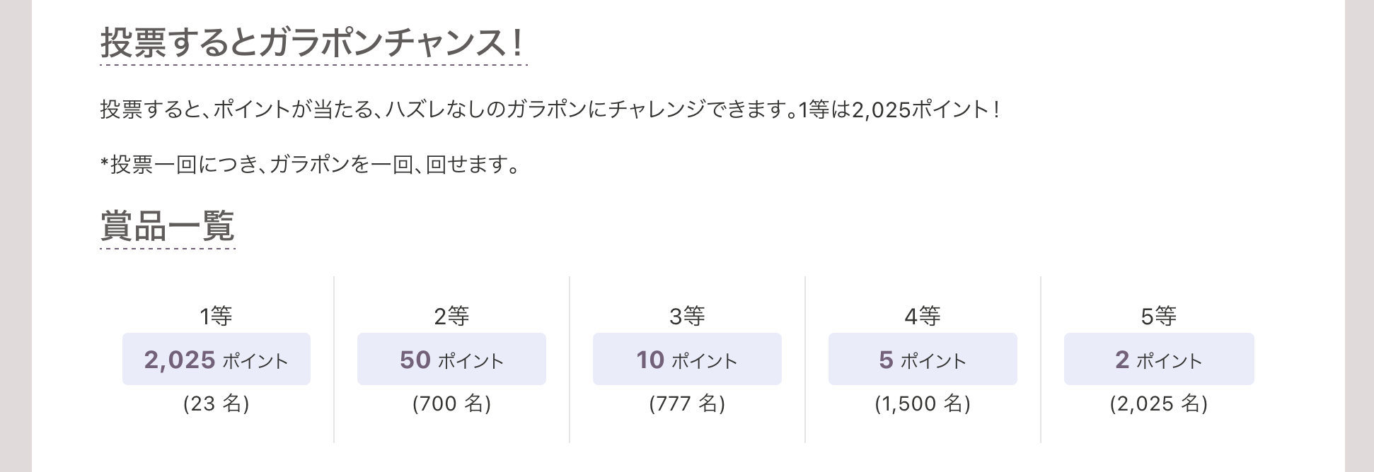 アワード投票すると、カフェトークで使えるポイントが当たる、ハズレなしのガラポンにチャレンジできます。1等は2,025ポイントです。*1ポイントは1円税抜