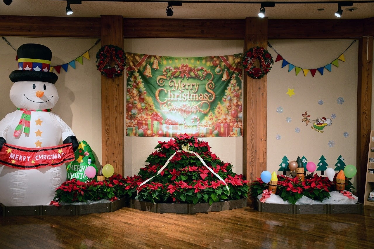 インフォメーションセンターでは、クリスマス気分を高める装飾を実施。高さ約3mのクリスマスツリーがきらめくオーナメントで来園者をお出迎えします。鮮やかなポインセチアをあしらったフォトスポットも設置し、記念撮影に最適。お子さまから大人まで、心温まる冬のひとときをお楽しみいただけます。