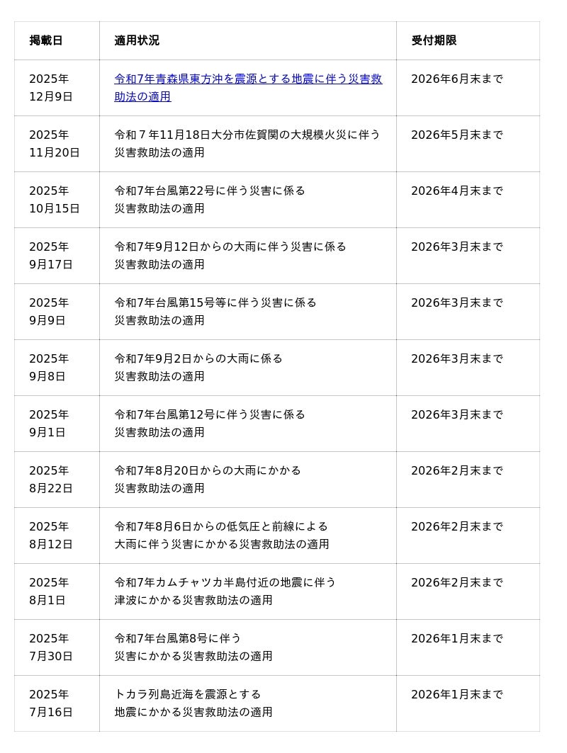 ※災害救助法適用地域の最新情報は内閣府のホームページにてご確認ください。