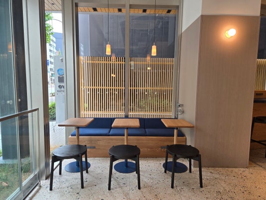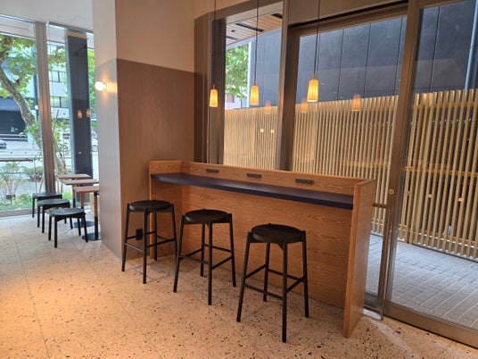 「it COFFEE 八丁堀店」全32席の空間に、多様なニーズに応える席をご用意しています。19席にはコンセントを完備し、作業に集中したい方にも最適です。このほか、コーヒーと静かに向き合えるカウンター席や、落ち着いてリラックスできるソファー席もご用意。家具は北海道産タモの天然木を使用し、ナチュラルで落ち着いた空間で、オフィスワーカーはもちろん、近隣の方々のコーヒータイムに適した、ゆったりとした席配置にしています。