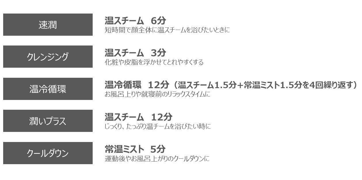 【運転時間(約)】速潤:6分、クレンジング:3分、温冷循環:12分、潤いプラス:12分、クールダウン:5分