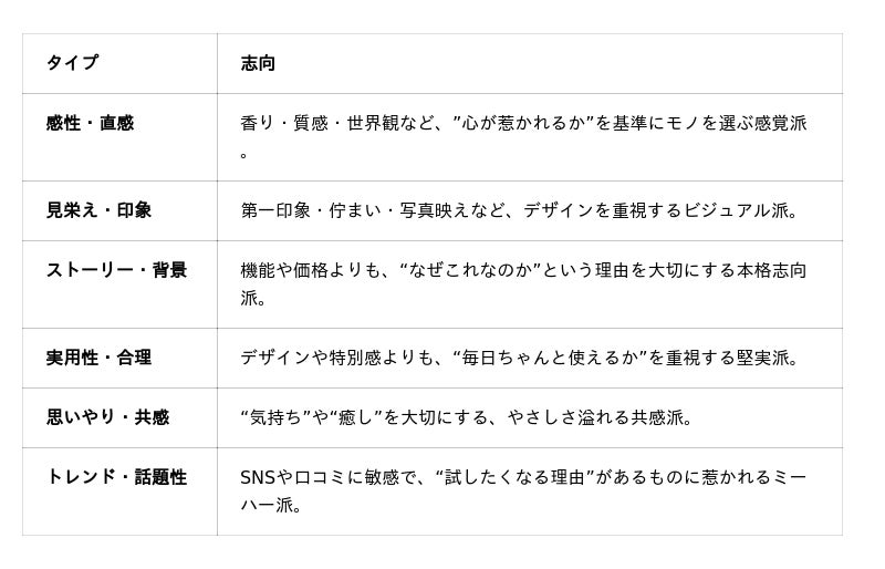普段の行動・リアクション・こだわりポイントから 「6つのギフト志向タイプ」に分類し、 彼が喜ぶ”身だしなみギフト”の方向性をわかりやすく可視化する診断ツール。