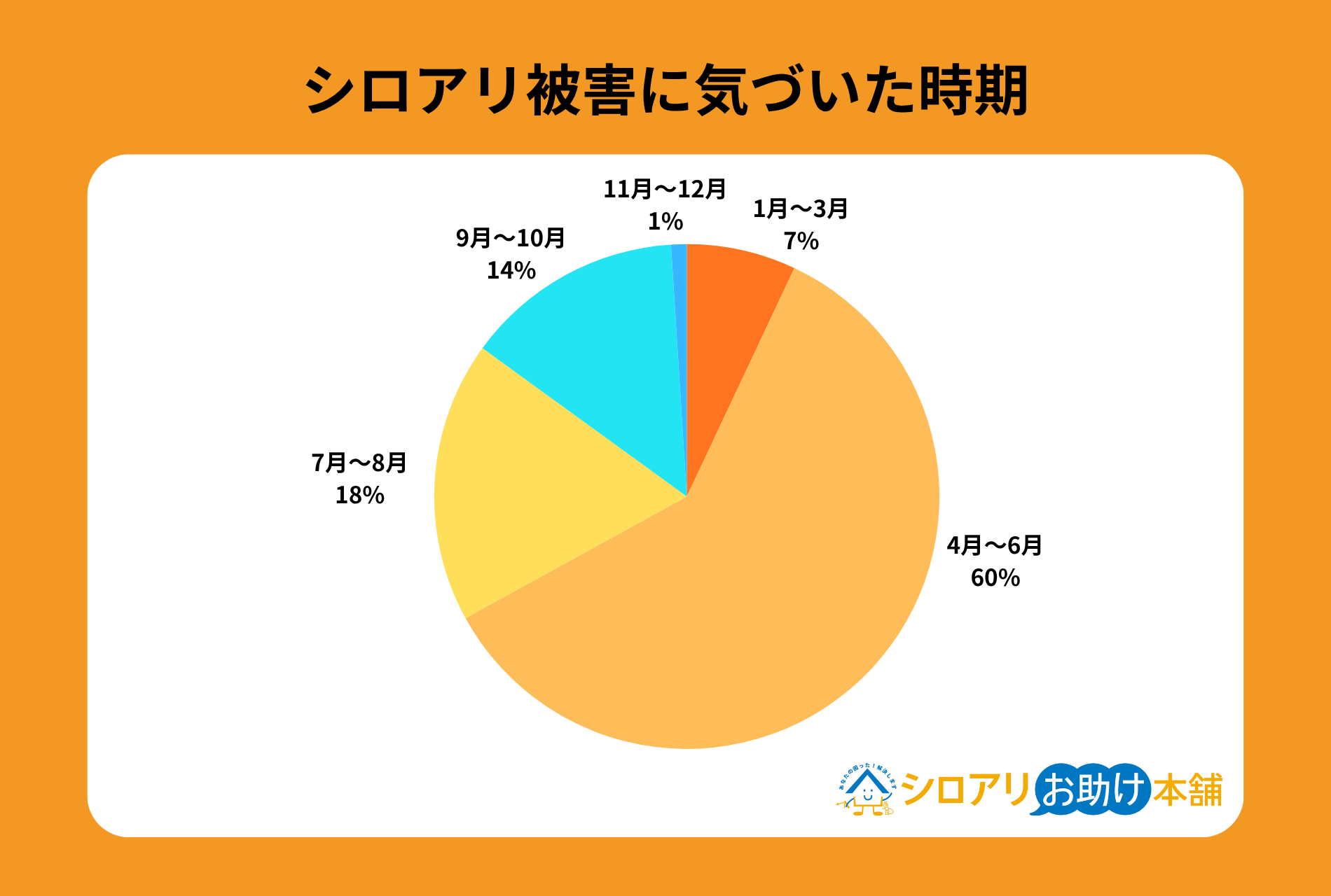 調査によれば、シロアリ被害に気づいた時期のうちもっとも多いのは冬の寒さが和らぎ、気温が上がる4~6月でした。この時期はシロアリが活発化し、羽アリが発生する時期でもあります。