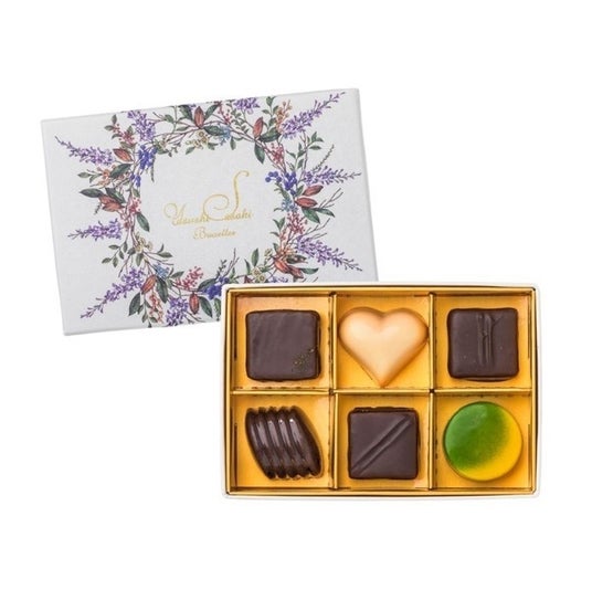 ブリュッセルで、2007年より自らの専門店を構える日本人パティシエ、佐々木靖氏。ビジュアルとフレーバーのバランスを重視した6種のアソートです。