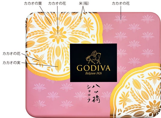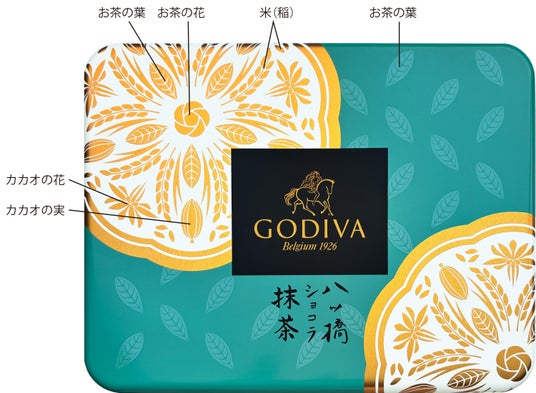 缶や個包装パッケージのデザインには、丸紋に八ッ橋の原料である“米”や“カカオ”をベースに、花や実・葉をあしらい和と洋の融合を表現しています。販売中の「八ッ橋ショコラ」にはカカオの花や実を、新発売の「八ッ橋ショコラ抹茶」にはお茶の花や葉をあしらいました。味に加え、デザインの違いもお楽しみください。