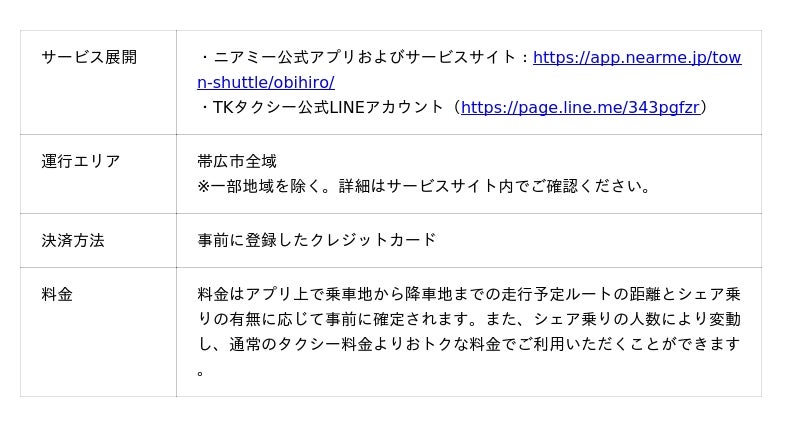 移動に関する課題解決に取り組むソーシャルデザインカンパニー、株式会社NearMe(本社:東京都中央区、代表取締役社長:高原幸一郎、以下「ニアミー」)が、株式会社TKタクシー(本社:北海道帯広市、代表取締役:小林義幸、以下「TKタクシー」)との連携のもと、北海道帯広市において提供している配車サービス「オビヒロコミ☆タク」がTKタクシーの公式LINEアカウント経由での予約を開始しています。