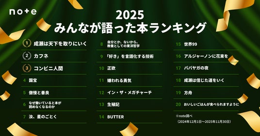 2025年にもっとも多くnoteで語られた本は、2024年に続き、シリーズ累計190万部を突破した宮島未奈さんの青春小説『成瀬は天下を取りにいく』が連覇しました。今年から発表項目に追加した、集計期間中に刊行された新作を対象とした「新着作品ランキング」では、朝井リョウさんがファンダム経済を描いた『イン・ザ・メガチャーチ』が1位を獲得しました。