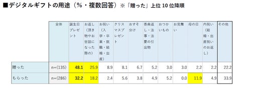 デジタルギフトの用途は「誕生日」のほか「ちょっとしたお礼・お返し」が多く、従来の贈り物カテゴリーにとどまらない利用の広がりもうかがえた。