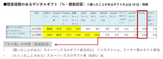 - 「その他」の自由記述をみると、贈答経験のあるデジタルギフトは「スターバックスのギフト券」が多かった。※単独項目として集計した場合には上位10位に入る。
