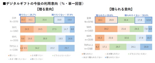 デジタルギフトは「気軽に贈れる・もらえる」が利点とされつつ「不慣れなので不安」「心がこもっていない」などの声も。今後の利用意向は、意見が分かれた。