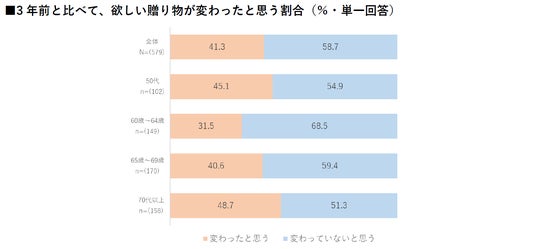 - なお、3年前と比較し、「贈り物として欲しいものの内容は変わった」との回答が各年代4割前後みられた。