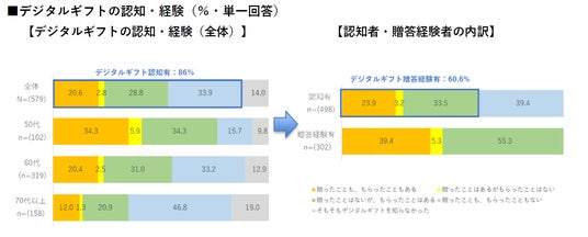 - デジタルギフトは全体の86.0%が認知。認知者ベースでの贈答経験のある人は60.6%。そのうち「贈ったことはないが、もらったことはある」は33.5%、「贈ったことはあるがもらったことはない」3.2%、「贈ったことももらったこともある」は23.9%だった。