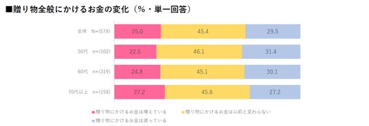 - 「3年前と比較したときの贈り物全般にかけるお金」は、全体では「以前と変わらない」45.4%と最も多く、「増えている」25.0%、「減っている」29.5%は同程度。