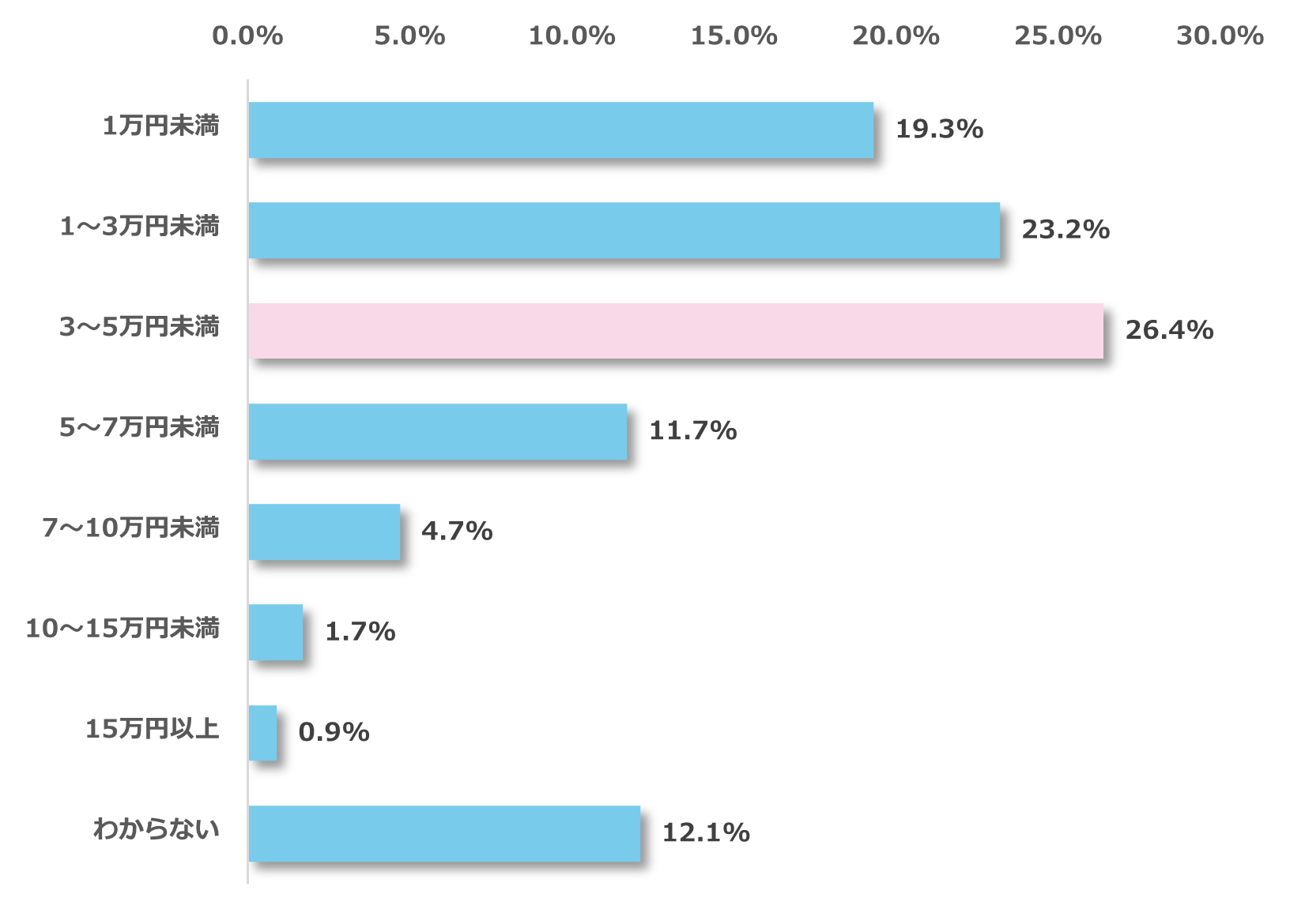 受験サポートにかけている毎月の平均費用について調査したところ、最多回答は「3万円以上5万円未満(26.4%)」でした。また、3万円以上と回答した家庭は全体の45.4%となり、“ほぼ半数に迫る”水準であることがわかりました。