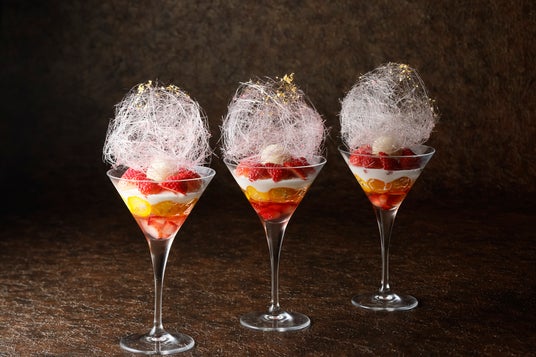 当ホテルでは、東京の夜景を一望できる「The Bar & Lounge」にて、食事やお酒の後に楽しめる“大人のデザート”を提供しています。実際にバーで提供しているお酒を使用しているほか、カクテルグラスやワイングラスなどに盛り付けた、バーならではの締めのデザートです。