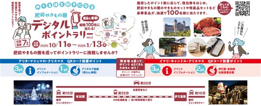 「イマリ・キャンドル・クリスマス」を一層楽しめるデジタルポイントラリーを開催します!会場でQRコードを読み取って、デジタルポイントを獲得。集めたポイントで宿泊券や特産品セットなど、豪華賞品の抽選に応募可能!さらに、同日開催の「アリタ・マシュマロ・クリスマス」とともに、両イベント会場では、開催中に獲得できるポイント数がアップ!イベント会場で是非チェックしてみてください。そのほか、肥前やきもの圏である佐賀県・長崎県の7つのやきものの産地に設置された42スポットでポイントが獲得できます!〈ポイントラリー概要〉