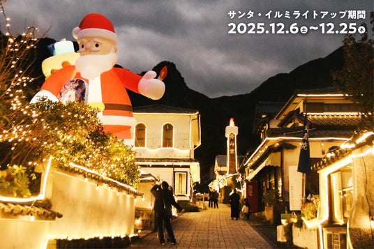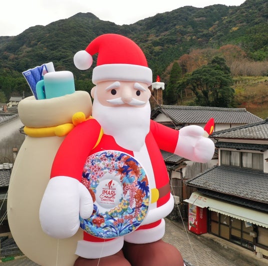 12月6日(土)から高さ10mの「巨大サンタクロース」が大川内山に登場し、「巨大えんとつキャンドル」や街並みを彩るイルミネーションと共に冬の街並みを明るく照らしています。